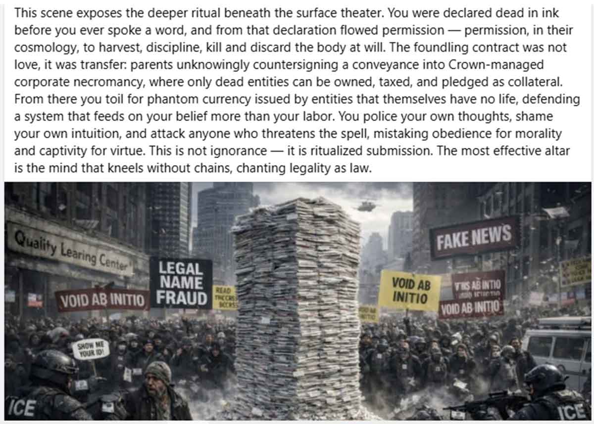 Hospitals, courts, and governments operate as arms of a global death cult — a Luciferian system that trades living souls for legal strawmen.